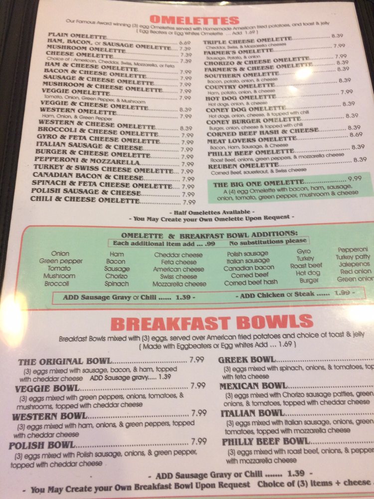 2 pork chops, with 2 eggs any style, home-made American fried potatoes and toast, and jelly. Toast Choice: Wheat Toast, White Toast. 2 Egg Style: Egg Beaters (+$1.20), Egg Whites (+$1.20), Over Easy Egg, Over Hard Egg, Over Medium Egg.
